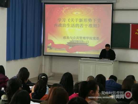2017年3月1日,政治与公共管理学院党委在博知楼102教室召开了全体党员学习会,继续深入推进“两学一做”学习教育活动。