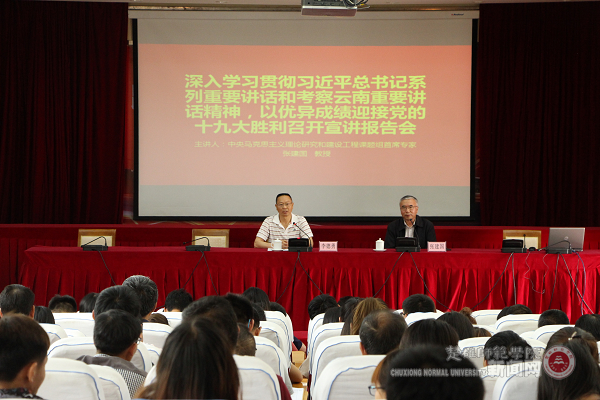 报告会上,省委宣讲团成员、中央马克思主义理论研究和建设工程首席专家、云南民族大学张建国教授应邀作习近平总书记系列重要讲话和考察云南重要讲话精神的主题宣讲报告。报告中,张教授结合国内外形势,就如何学好习近平总书记系列重要讲话和考察云南重要讲话精神,围绕“理解学习的重要意义,解决为何学”;“态度端正,方法得当,学会如何学”;“整体为先,角度为要,明白学什么”;“把握精神和内涵,落实怎么做”四方面的内容与师生交流了学习习总书记系列重要讲话和考察云南重要讲话精神的深刻体会。